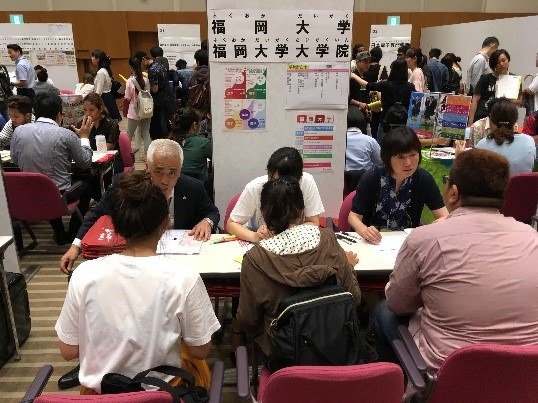 「外国人学生のための進学説明会」は、主に日本語教育機関に在籍している外国人学生を対象に、大学院・大学・短期大学・専門職大学・専門学校といった高等教育機関の入試広報担当者が一堂に会し、授業の内容や入試などに関する情報を直接提供する進学イベントです。