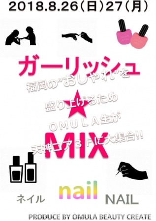 【企画概要】「若者の目で見て、感じる新たなファッショントレンド」をいち早く発信するとともに、地元福岡から次世代のトレンドリーダ-を育成することを目的として、「ガーリッシュ★MIX」と題し、3つのイベントを通してみなさまへ季節に合わせた「オシャレ」を発信します。メイクアップ科の学生が、授業で身につけたネイルやヘアアレンジ等の技術をお客さまに提供するだけでなく、学生自身が情報の発信源となることを目指します。