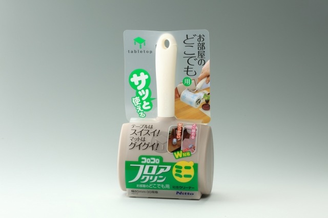 「コロコロミニフロアクリン」は、コンパクトなサイズで、お子様の手になじみやすく、強粘着の糊と弱粘着の糊を独自のパターンで塗工した「W粘着」により、カーペット、畳、フローリングなど様々な材質の床に対応できるため、お子様にも安心して使っていただけます。