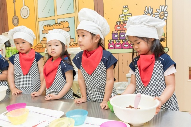 キッズデュオインターナショナルならではの英語を使ったオリジナルのカリキュラムのひとつである「ラーニングステーション」では、ベーカリー、スーパーマーケット、TVスタジオ、消防署などをテーマにさまざまな職業が体験できます。今回は、キッズデュオインターナショナルが一般企業と共同で本格的な食育プログラムを初めて開発。英検準2級合格の園児も輩出する同園の5~6歳児が、英語による生きたコミュニケーションを活かす機会となります。