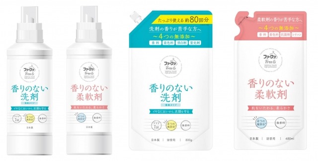 NSファーファ・ジャパン株式会社ではそうした消費者のニーズを踏まえ、香りが苦手な人でも、安心してお洗たくできるランドリーシリーズ「ファーファ Free&」を発売開始します。本商品は香料など4つの成分が無添加と、安心してお洗たくできる原料を使用しながらも、長年研究開発を行ってきたNSファーファ・ジャパンの研究により、満足な洗い上がりを実現。“においから守る、香りのない洗剤”「ファーファ Free& 超コン液体洗剤無香料」と、“肌をいたわる、香りのない柔軟剤”「ファーファ Free& 柔軟剤濃縮無香料」の2商品を展開します。