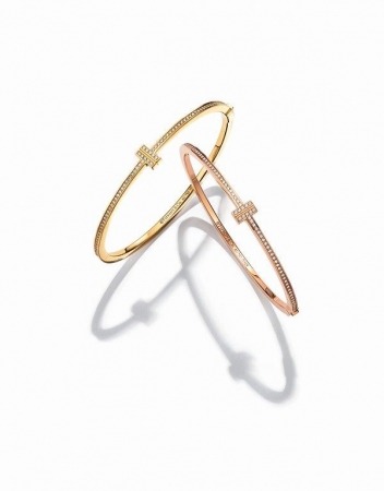 18Kイエローゴールド、ホワイトゴールド、ローズゴールドで展開するバングルは、大胆に組み合わせた2つのTのモチーフのアクセントにダイヤモンドの繊細な連なりが手首を飾ります。