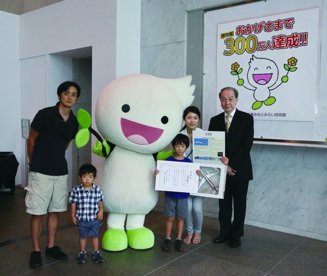 三菱みなとみらい技術館(横浜市西区、館長 久保庭 章夫)は2日、開館以来の入館者が通算300万人を突破しました。300万人目の入館者となったのは、横浜市神奈川区在住の山田さんご一家で、久保庭館長から感謝状と記念品が贈られました。