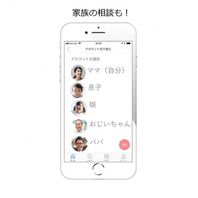 1台のスマホで最大5人までプロフィールを登録し相談が可能です。 お子様や、ご両親の相談もしていただけ家族の健康のお悩みにも回答します。