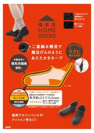 「備長炭ホームソックス」は、二重編み構造で魔法びんのようにあたたかさをキープするソックスです。