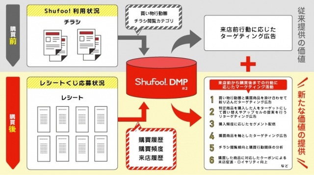 今回、Shufoo!掲載店舗でのお買い物のレシートで応募できる「レシートくじ」を提供することにより、ユーザーのShufoo!掲載店舗への来店、購買行動を後押しするとともに、実際の購買行動や購買された商品情報をDMPに蓄積し、購買前のチラシ閲覧ログと紐付けることが可能になります。