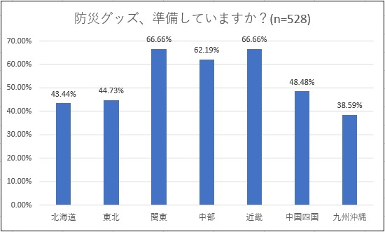 一方、防災グッズを準備していると回答したママは、関東・近畿地方が66.66%と同率で最多。次いで中部地方(62.19%)でした。