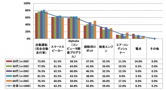 まずAI技術が使用されていると考える商品・サービスを伺いました。全体では「自動運転」が76.9%と最も多く、「スマートスピーカー」62.2%、「AlphaGo」60.8%と続きます。年代別だと、20代の「電卓」、60代の「掃除用ロボット」、「エア・コンディショナー」が他年代に比べて高くなっています。