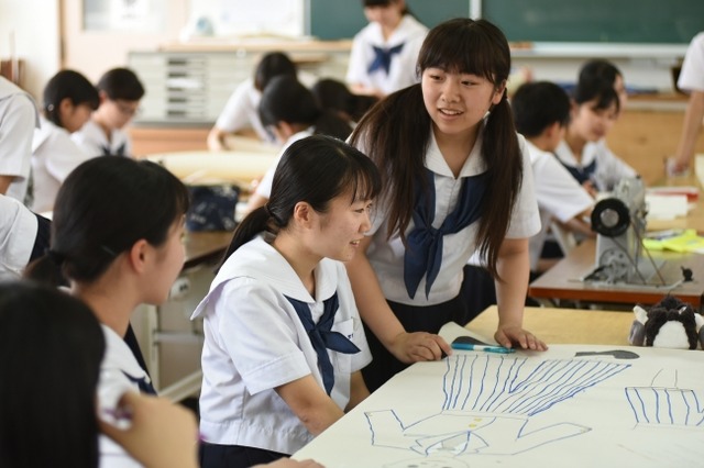 また、校内行事だけではなく、企業の制服を手掛けたり、県内外のファッションイベントの企画・運営を通した実習、小学校で家庭科の授業補助等、実践を交えたさまざまな授業が日々実施されています。