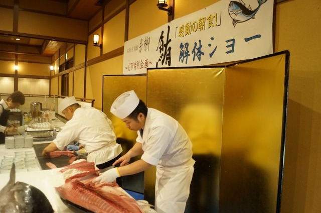 株式会社石和名湯館糸柳(代表:内藤 修也 所在地:山梨県笛吹市石和温泉)は、2018年9月より毎月第2・4水曜日の朝食限定で、当館自慢の「感動の朝ごはん」時に『マグロの解体ショー』を開催する運びとなりました。