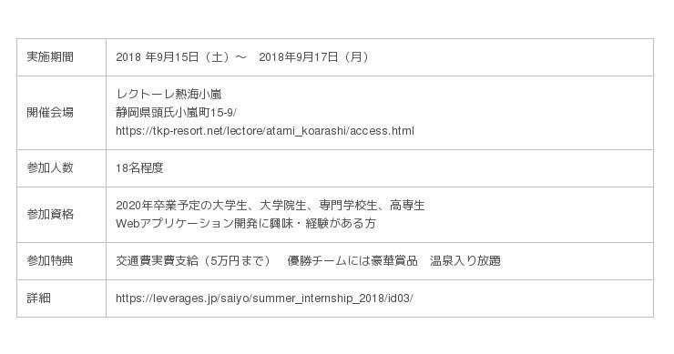 レバレジーズは、9月15日~17日に静岡県熱海市の温泉宿で「湯けむりハッカソン」を開催します。エンジニア・デザイナー志望の学生採用の一環として2014年より実施。今回は18名程度の学生が2泊3日の合宿で、レバレジーズで活躍するエンジニアと共に自社の課題を解決するサービス創りに打ち込みます。