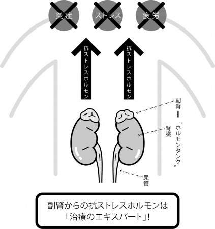 それは、私たちが肉体的にも精神的にもストレスを受けた瞬間、「副腎」という小さな臓器から「抗ストレスホルモン」が分泌され、あらゆる「炎症」を抑えているからです。