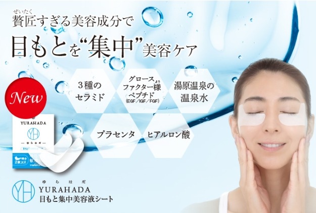 「YURAHADA 目もと集中美容液シート」は、潤い成分として3種のセラミド※1やグロースファクター様ペプチド※2、プラセンタ、酵母エキス※3、ビタミンC誘導体※4、コラーゲン、ヒアルロン酸などの美容席成分を贅沢に配合。さらに潤いを与える4種の植物オイルと13種の植物エキスを配合した贅沢至極のアイテムです。目もとの広範囲を覆う大きめサイズで肌に密着しやすいシートで気になる部分をしっかりとカバーします。