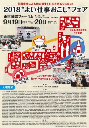 全国の信用金庫では、平成30年9月19日(水)・20日(木)の2日間、東京国際フォーラムで、「被災地復興応援」「地域連携」「地方創生」をメインテーマとした「2018“よい仕事おこし”フェア」を開催。全国47都道府県から212の信用金庫が協賛し、過去最多の約490社がブース出展します。