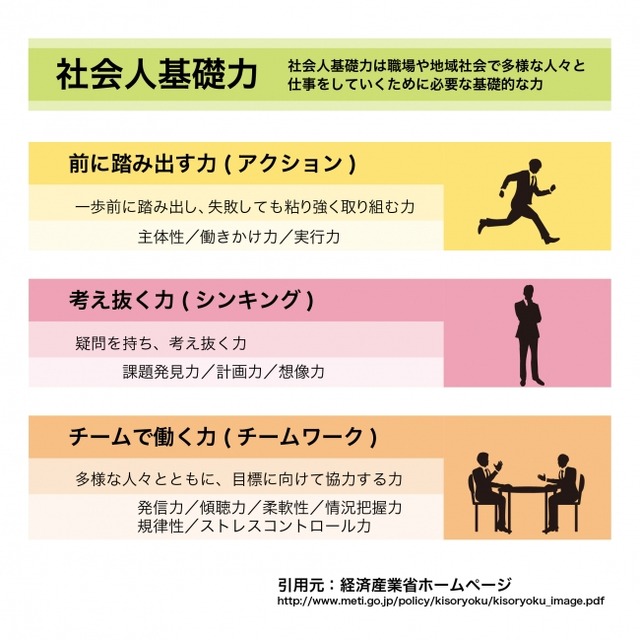 大学入試改革を理解するためには、背景となる経済産業省が提唱している「社会人基礎力」が何かをまず理解する必要があります。社会人基礎力とは「社会人基礎力は職場や地域社会で多様な人々と仕事をしていくために必要な基礎的な力」であり、3つの能力、12の要素から成ると定義づけされています。