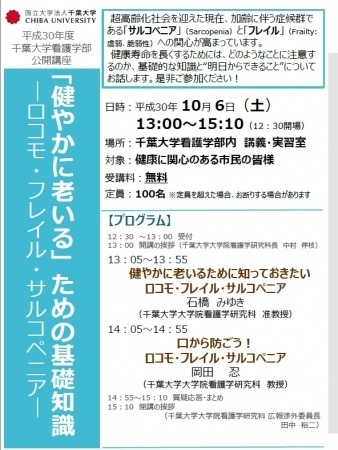 超高齢化社会を迎えた現在、加齢に伴う症候群である「サルコペニア」(Sarcopenia)と「フレイル」(Frailty:虚弱、脆弱性)への関心が高まっています。 健康寿命を長くするためには、どのようなことに注意するのか、基礎的な知識と"明日からできること"についてお話します。是非ご参加ください!