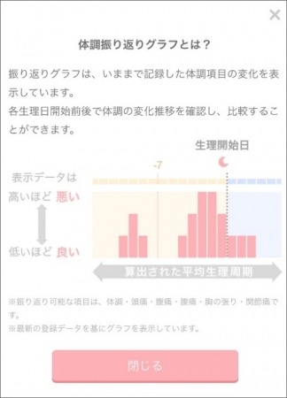 「体調管理機能」は、記録した体調の変化と生理周期を結び付けて、グラフや一覧で確認することができます