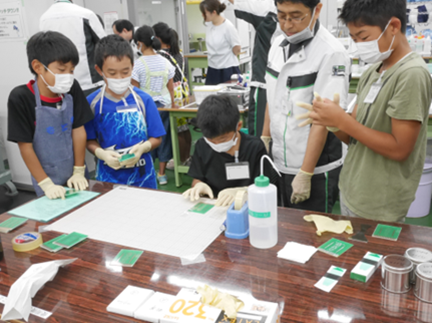 「子ども大学らんざん」は、嵐山町教育委員会が生涯学習推進事業 として実施しており、夏休み企画として子どもの知的好奇心を刺激する 講義・体験が全3日間で行われました。最終日の8月21日は太陽イン キ製造の社員が講師となり、小学4年生から6年生までの15名が、工 場見学及び製品の品質チェックを行う検査業務、社員食堂での食事 も体験しました。 上記の取り組み以外にも、嵐山町に生産拠点を持つ太陽インキ製 造では、毎年、地元小学校の社会科見学が行われています。また、 地域のお祭りでは化学実験教室を開催するなど、化学メーカーとして、 化学の面白さに触れてもらえる機会をつくっています。