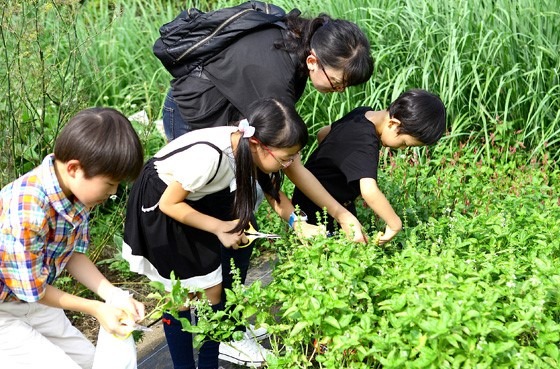 薬草の「歴史」を学ぶ授業では、水戸光圀がまとめさせた日本初の家庭の医学書『救民妙薬』で紹介されている薬草の活用術をクイズ形式で学び、「今」を学ぶ授業では、地域のハーブ農家で採れた朝摘みのハーブに実際に触れて、味や香りを体感し、自分たちの暮らしのどこにハーブが使われているか、その効能や使い方を学びます。