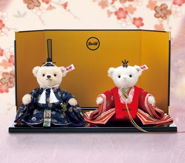 前作に引き続きひな人形で有名なブランド『寿慶』とシュタイフ社で製作したひな人形テディベア。豪華な衣装の「まり」は丸い形から万事丸くおさまるとの意味があり「家庭円満」「平和な日々」を祈ります。