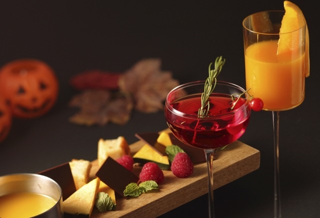 ホワイトチョコレートにドライフルーツやカボチャのチップスや紅芋チップスなどの秋らしいチップスをチョコレートフォンデュにディップしてお召し上がりいただきます。また、バーテンダーがハロウィンをイメージしたオリジナルカクテルもお愉しみいただけます。