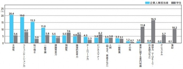 これによると、学生は、「語学」や「業界の専門知識」を始めとする可視化しやすい知識をスキルとして身につけなければならないと考えていますが、一方で企業側はそれよりも「主体性」や「コミュニケーション力」、「粘り強さ」など(いわゆる)行動や姿勢を身に着けて欲しいと考えていることが分かります。