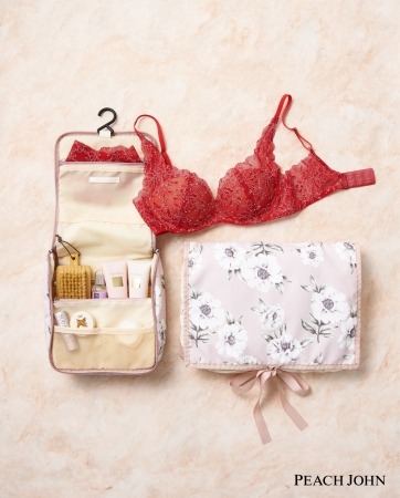 それぞれのコフレにセットとなるポーチは2種類をラインナップ。取りだしやすく優秀な「トラベルポーチ」(左)は、ファスナーポケットが3 つ、メッシュポケット2つ付きの吊るせるタイプ。キャミソールなどの収納にも便利な「ランジェリーポーチ」(右)はポケットを2つ内蔵し、リボンで結ぶ巾着仕様です。ポーチの柄は、9月26日(水)発売のルームウエアの新作「裏起毛サテンシャツパジャマ」とお揃いです。