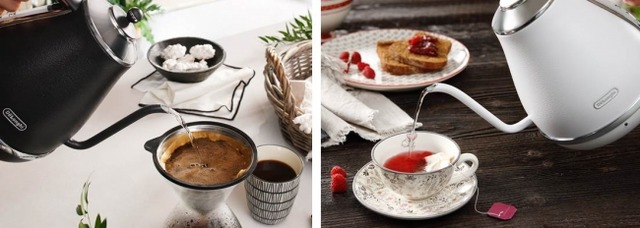 今回発売する『デロンギ アイコナ 電気カフェケトル(KBOE1220J)』は、お湯の注ぎやすさとデザインにこだわったデロンギ初の細口タイプのケトルです。計算しつくされた注ぎ口のカーブ曲線と先端の形状を組み合わせることで、狙ったところに正確にお湯を注げ、注ぐ量の微調整も思いのままコントロールできます。また、お湯がこぼれにくく、まわりへ飛び散りにくい仕様となっているので、カップや急須に直接そっと注げます。『デロンギ アイコナ 電気カフェケトル』の色はピースフルホワイトとプレステージグレーの2色で、本体にはステンレスを使用し、高級感と耐久性を兼ね備えながら独自の塗装により表面に凹凸を施したデロンギらしい、洗練されたデザインとなっております。