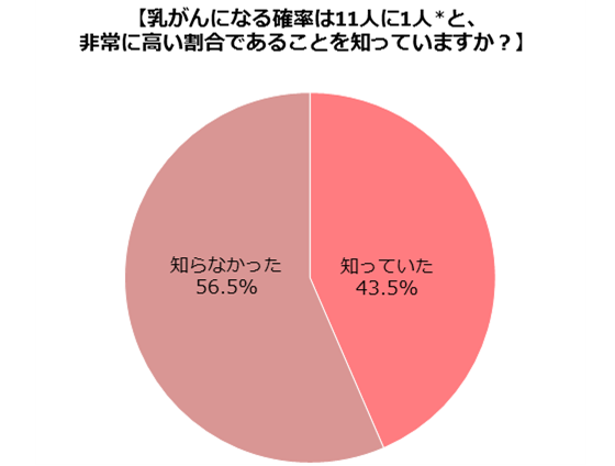 「乳がんについて関心がありますか?」という問いに対し、全体の95.1%にのぼる1,427名が「とても関心がある」「まあ関心がある」と回答し、乳がんに対する関心が非常に高いことが判明しました。現在、生活の変化に伴い乳がんにかかる人は国内で年々増加傾向にあり、生涯で11人に1人という高い確率で乳がんにかかる可能性がある*といわれています。しかし、この事実を知っている人の割合は4割に留まっており、乳がんに対する関心が高い一方、がんリスクの高さに対する認識は低いことが伺えます。