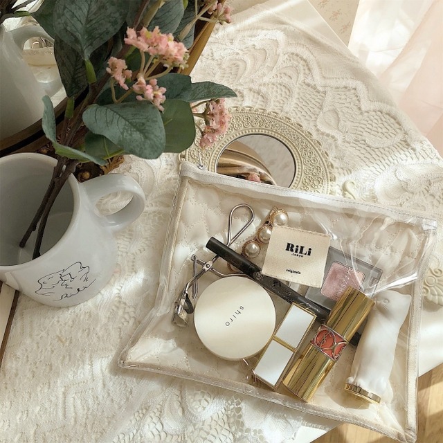 ▲リップやお気に入りのアクセサリーなどを入れて写真映えもする、可愛い透明ポーチ。