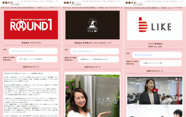 学生一人につき一応募しかできないことで第一志望の企業に本命を伝えることを目的とした、新しい新卒の就職活動・採用情報サイト『本命ナビ』(http://www.hommeinavi.com/)は、情報感度の高い本命の学生を採用したい企業を掲載しています。既にラウンドワン様、幻冬舎メディアコンサルティング様、ぼてぢゅうグループ様といった「上場企業」から「ベンチャー企業」まで約100社が参加しています。