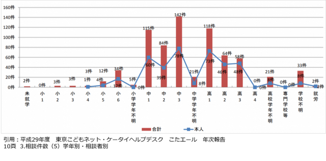 また、東京都が開設した、青少年の抱えるインターネット・携帯電話に関するトラブルの相談窓口「東京こどもネット・ケータイヘルプデスク(こたエール)」へのネットいじめや架空請求詐欺、削除方法などのインターネットトラブル相談件数は、小学校6年生から中学校1年生にかけての増加率が最も高く、約3倍にのぼります(参照:引用図)。