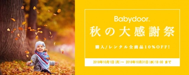 Babydoor株式会社(東京都豊島区、代表取締役社長:中川阿美)は、2018年10月1日(月)~2018年10月31日(水)の期間、「秋の大感謝祭」と題して大人気ベビー用品をお得にレンタル・ご購入できるキャンペーンを実施いたします。
