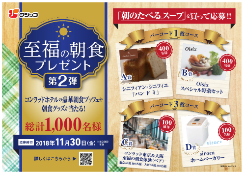今回のキャンペーンでは、期間内に、手軽に栄養がとれる人気シリーズ「朝のたべるスープ」を購入しバーコードを貼付け応募すると、総計1,000名様に、朝食時間を至福にするプレゼントが当たります。コンラッド東京&大阪の豪華な朝食ブッフェや高級食パン、「朝のたべるスープ」と一緒に食べると美味しいパンを焼けるホームベーカリーなど、豪華なプレゼントをご用意しております。