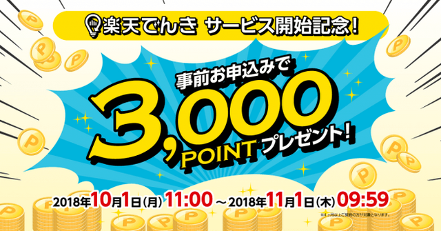 なお、今回の「楽天でんき」提供開始を記念して、10月1日(月)11時より、「楽天でんき 事前お申し込みキャンペーン」を開始します。キャンペーン期間中にご契約いただいたお客様全員に「楽天スーパーポイント」3,000ポイントをプレゼントします。