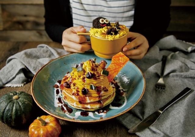 3段重ねのパンケーキに、秋限定のパンプキンクリームのデコレーションで、見た目のかわいさも◎