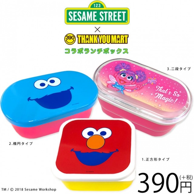 店内全品390円+taxでおなじみのサンキューマートでは、2018年10月1日(月)より、全国サンキューマート・WEBショップにて「セサミストリート」と「サンキューマート」コラボランチグッズを販売開始致します。