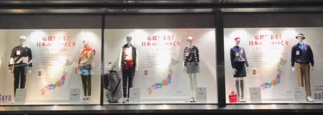 ハルクスポーツ1階道路側の3面ウィンドーには「応援しよう!日本のものづくり」との呼びかけの下、「PEARLY GATES」「MASTER BUNNY EDITION」「23区GOLF」「Black & White」の4ブランドの「J∞QUALITY」商品のコーディネイトがディスプレイされます。さらに、ハルクスポーツ1階バスターミナル側正面入り口左手の「ZOY」のウィンドーでも「J∞QUALITY」認証商品のコーディネイトがディスプレイされます。