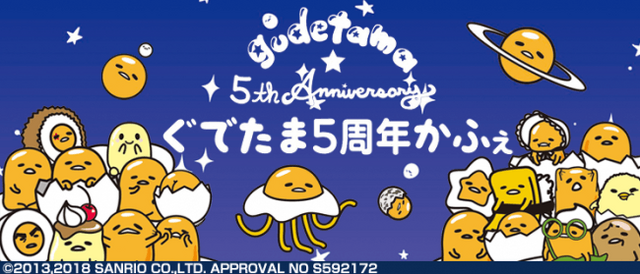 サンリオの大人気キャラクター「ぐでたま」の5周年を記念して、宇宙に飛び出した感たっぷりの「ぐでたま5周年かふぇ」を期間限定でオープンいたします。ぐでたまがUFOを操縦している姿や、ぐでたまが惑星に変身したフード、デザートメニューが楽しめます。また、限定グッズなども販売いたします。