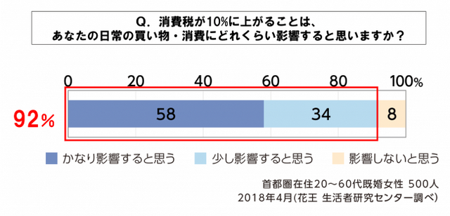2014年に消費税が5%から8%になり、2019年10月に消費税が8%から10%に引き上げになる予定です。花王株式会社「生活者研究センター」(※1)では、生活者の買い物や家計意識についての調査を継続的に実施。2018年4月の時点では、首都圏在住の既婚女性の9割が「増税は買い物・消費に影響する」、6割は「増税までに家計を見直したい」と思っていることが分かりました。