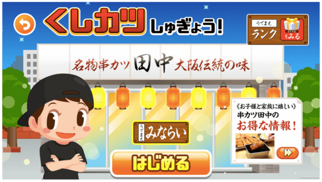 串カツを揚げる体験ゲームです。素材を「生地」につけて、衣付けをします。次に、師匠(ナレーション:社長 貫啓二)から出されるオーダーに合わせて、串カツをフライヤーの中に入れ、ちょうど揚がったタイミングでバットに移します。 時間内に何串揚げられるかで、プレイ終了時の師匠の評価が変わります。「目指せ!1,111本」をテーマに、揚げた本数でうでまえランクが上がる仕組みを取り入れています。
