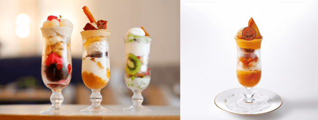 見た目から秋を存分に楽しめるパフェは、リンゴのコンポートにカルヴァドスの香るカスタードクリーム、シナモン風味のチュロスを添えました。フロランタンやプラリネなどが食感のアクセントとなり、キャラメルのアイスクリームやソース、クリームがバランスよく重なり合います。
