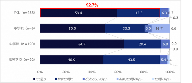「生徒の視力が低下していると感じる」という質問に対して、92.7%の養護教諭が「そう思う」「ややそう思う」と回答しており、教育現場において、多くの養護教諭が子どもたちの視力低下を感じている結果が明らかになりました。