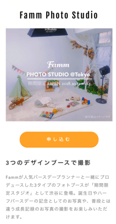 100万人の子育てママが利用する家族アルバムアプリ「Famm(ファム)」を運営する株式会社Timers(タイマーズ)(渋谷区 代表取締役社長:高橋才将)は、10/11(木)-14(日)の期間限定でバースデープランナーとプロデュースしたフォトスタジオ「Famm Photo Studio」を渋谷にOPENいたします。3タイプのフォトブースで、1時間のあいだ参加者はセルフで子供を撮影し放題となっており、10分間はプロカメラマンに撮影してもらうことができます。完全事前予約制で入場料1,000円~のモデルとなっており、既存のスタジオや写真館よりも気軽に体験できるフォトスタジオとなっています。