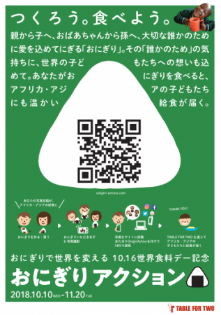 「おにぎりアクション2018」は、本キャンペーンの一環として開催。期間中、対象商品の購入や、写真の投稿が寄付に繋がり、アフリカ・アジアの子どもたちに温かい給食をプレゼントすることができます。