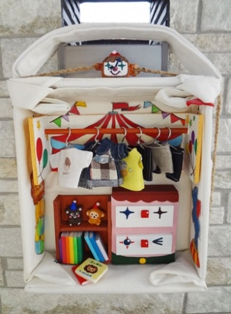 私は、大切にしているドール(縫いぐるみ)の服を趣味で作成しているのですが、その服の収納スペースが欲しいなと思い、持ち運べる&飾れるクローゼットをトートバッグで表現しました。デザイン、イラストについては(クローゼットが)「ワクワクするものが詰まっている」と言う部分でサーカスと共通するとイメージし関連の動物等を描きました。