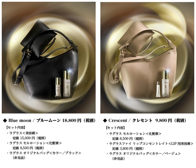 さらに、今年も「ラグラス オリジナルバッグ」(カラー : Blue moon/ブラック、Crescent/ベージュ)がセットとなります。ご自身のお好みのスタイルで形を変えられる「3WAYバッグ」にオリジナルポーチがセットとなった今年のバッグは、使いやすさと機能性に加え、様々なスタイルにマッチする、上質で華やかなスペシャルギフトとなりました。