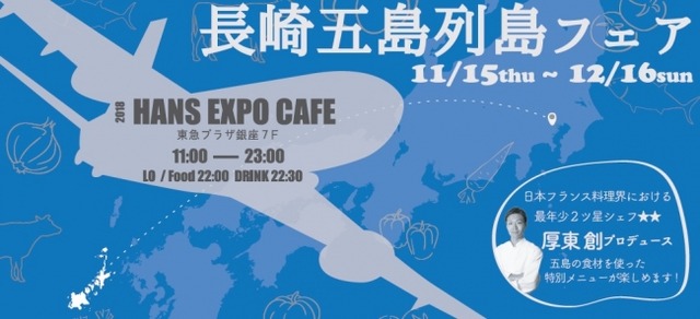 2018年11月15日(木)~12月16日(日)の約1か月間、東急プラザ銀座7階「HANDS EXPO CAFE」で、長崎五島列島フェアを初開催。五島列島(長崎県五島市)のこだわり生産者がカフェに食材を直送。五島牛や五島灘で獲れた新鮮な魚、こだわりを持って栽培した新鮮な野菜を使ったメニューを味わえます。