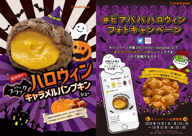 10月1日~10月31日の期間中にキャンペーン対象SNS(Twitter・Instagram)にてビアードパパにまつわる写真付き投稿いただいた方の中から抽選で合計パイシュー(カスタード)100個分のビアードパパ商品券をプレゼント。