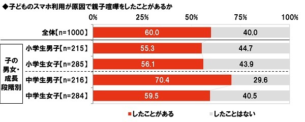 ▼子どものスマホ利用がきっかけで親子喧嘩勃発 6割が経験 中学生男子の親では7割